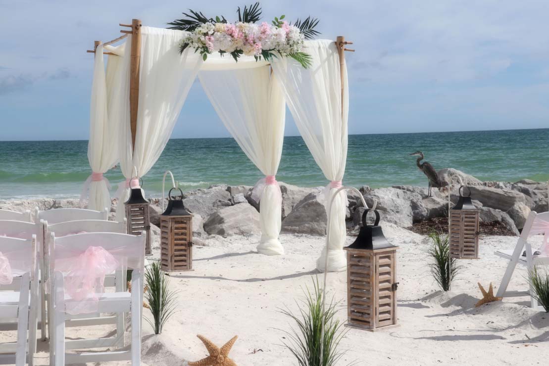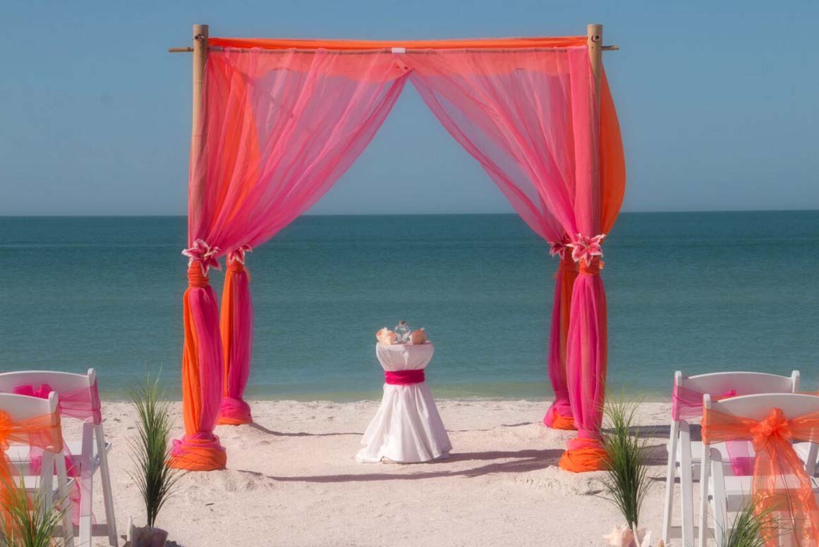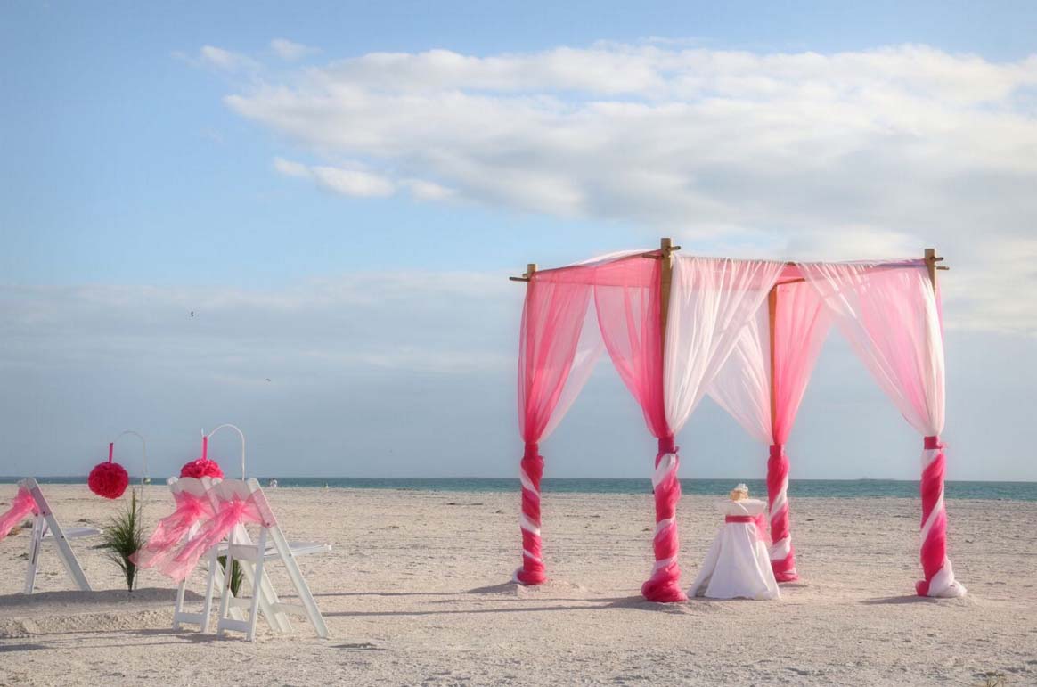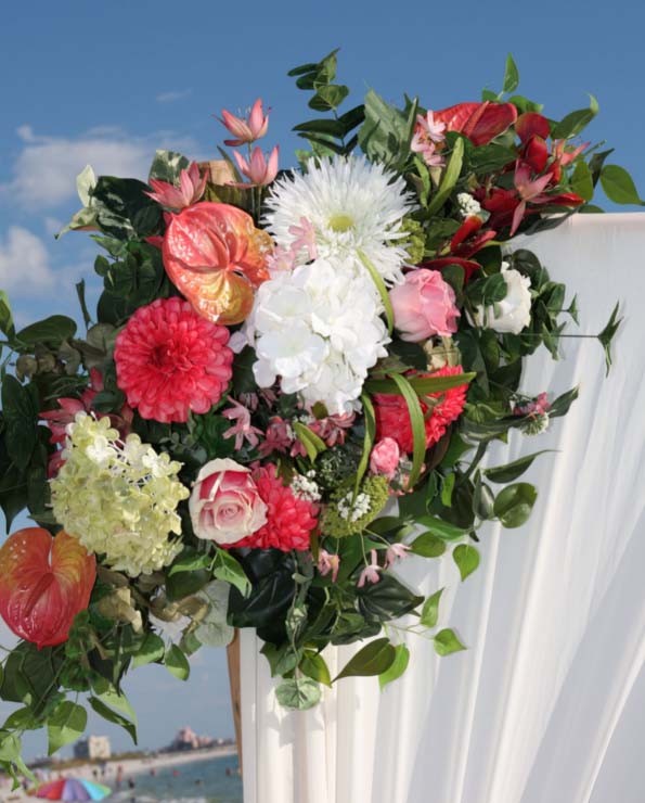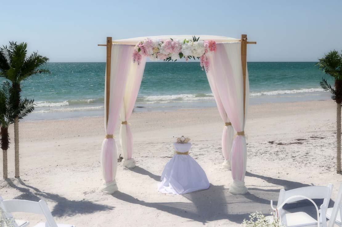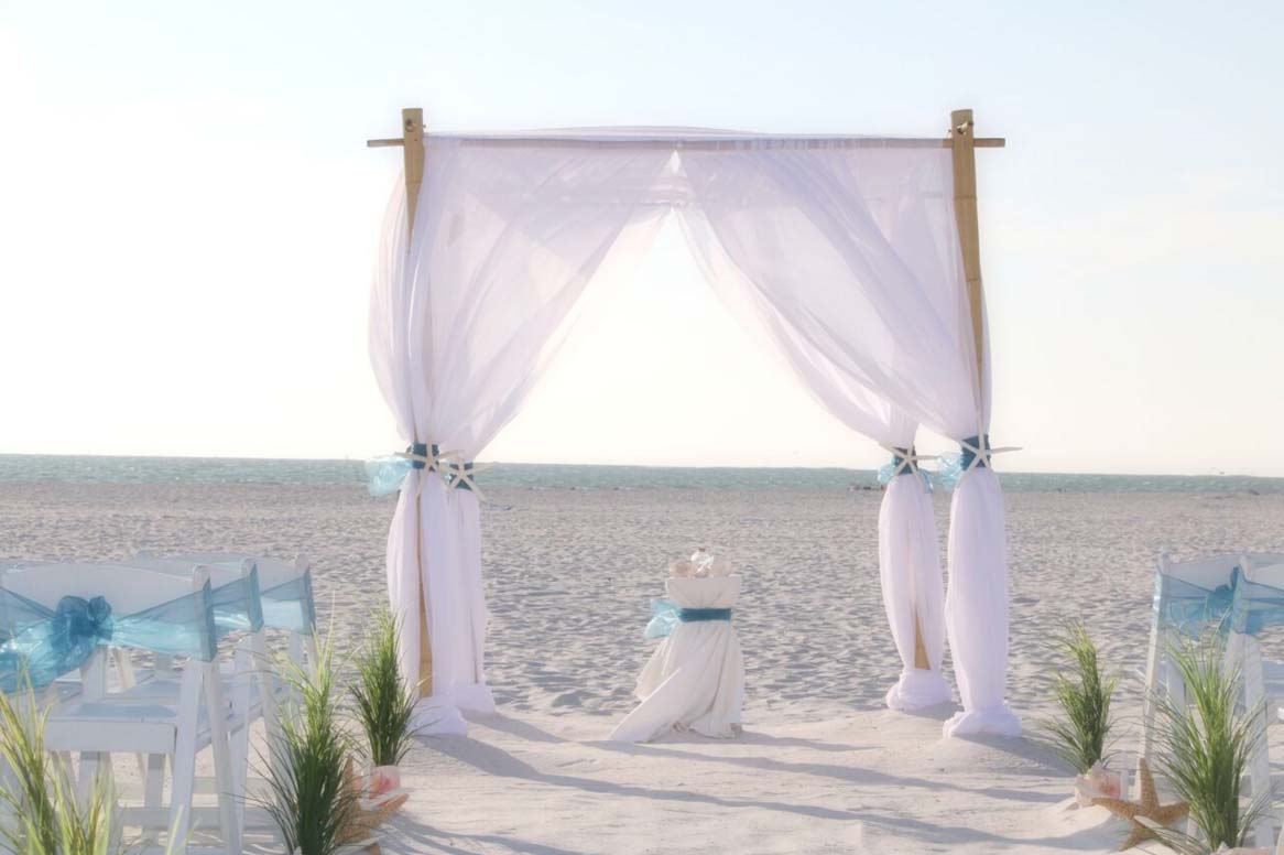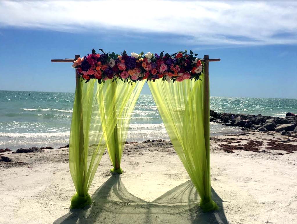 There are many choices for your beach wedding arch. Subtle colors or vibrant chiffon, two posts or four posts. Elegance and shimmer with our crystal drape or a chandelier... At Suncoast Weddings we understand this is your day and that's why we'll tailor a ceremony for the two of you. We've included galleries to inspire although if you don't see the 'look' you want, let us create it for your unique day.