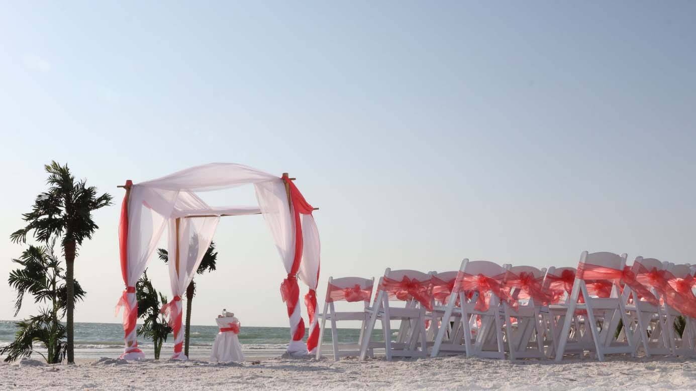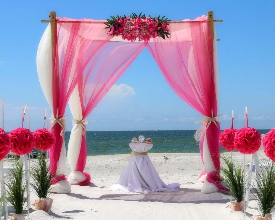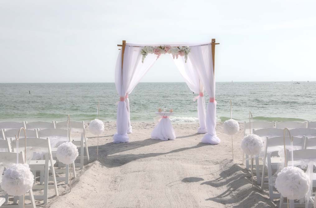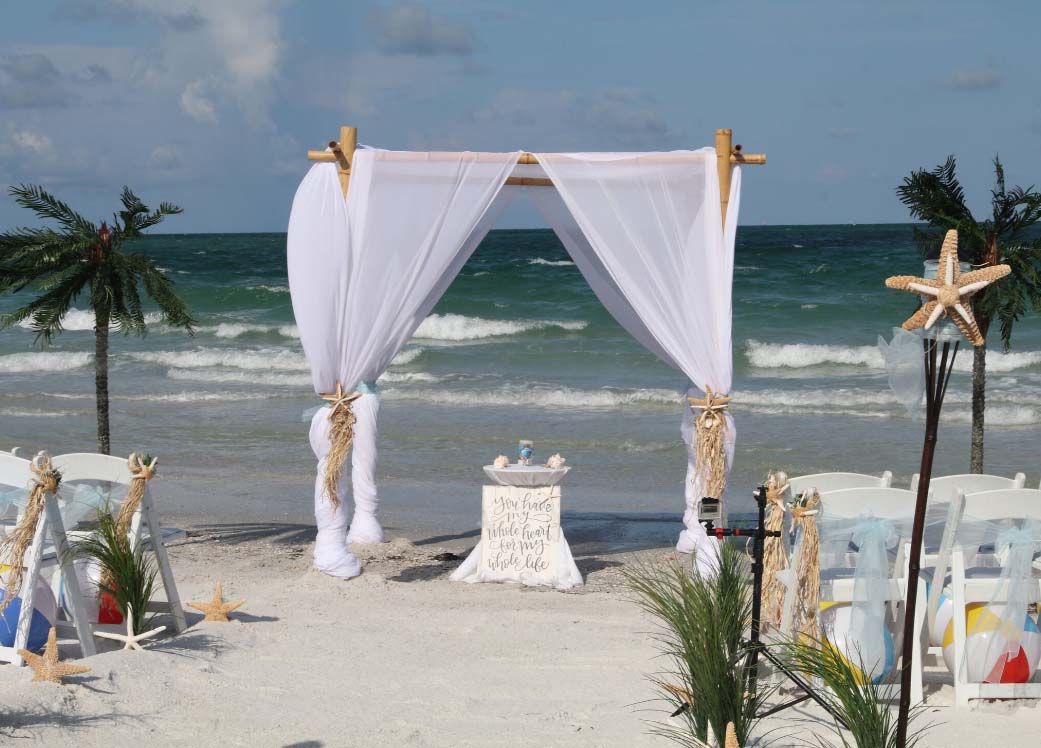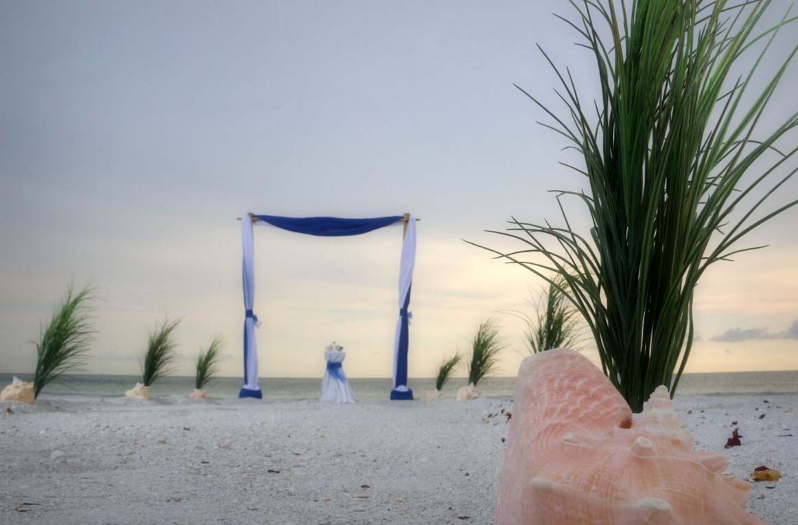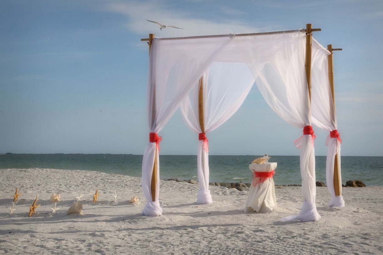 There are many choices for your beach wedding arch. Subtle colors or vibrant chiffon, two posts or four posts. Elegance and shimmer with our crystal drape or a chandelier... At Suncoast Weddings we understand this is your day and that's why we'll tailor a ceremony for the two of you. We've included galleries to inspire although if you don't see the 'look' you want, let us create it for your unique day.